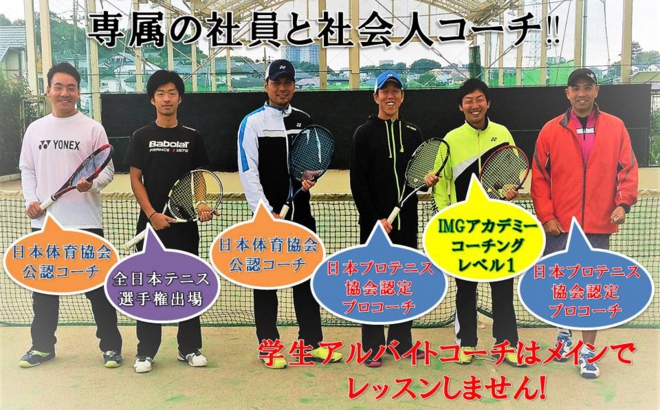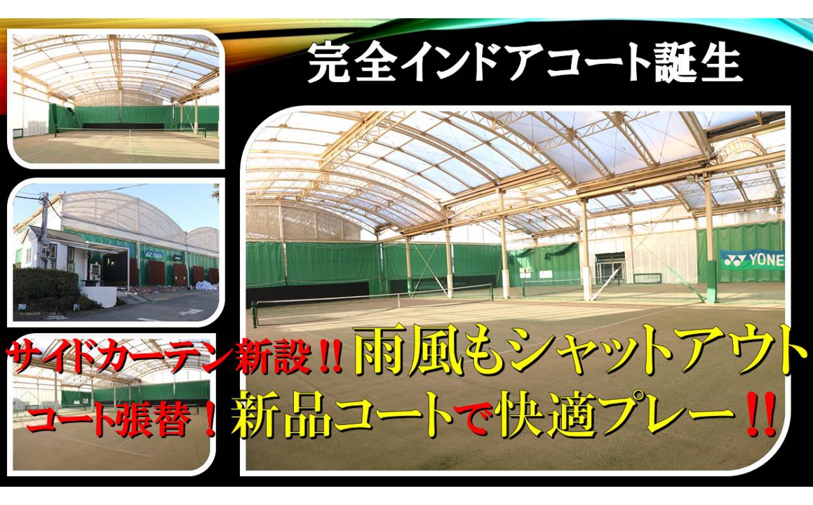 サイドカーテンを全コートに設置!雨風に負けないコートが完成しました。サーフェイスも新品に張り替えて快適にプレーできます。 専属コーチがメインでレッスンさせて頂きます。クラブハウス内にプロショップもございます。ラケット、ウエアー、シューズ、小物まで用意いたしております。カフェスペースではこだわりのコーヒー他豊富なドリンクがございます。 レッスン後に是非お楽しみ下さい。 スクール生のお子様に大人気!!駄菓子コーナーもございます。30円特設コーナーもございます。